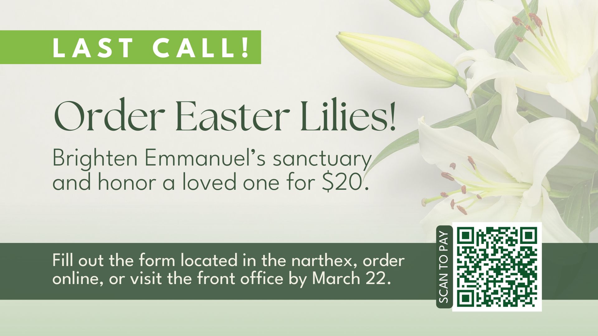As we prepare to celebrate the joy and hope of Easter at Emmanuel, we invite you to order a beautiful Easter lily to help decorate our sanctuary.